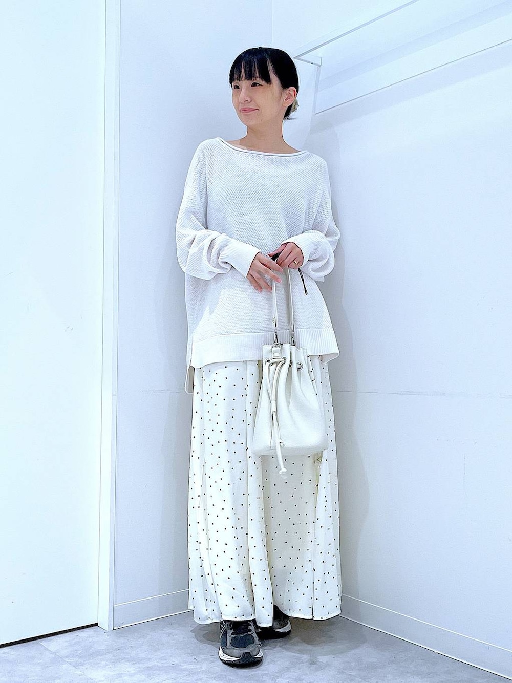 春らしくホワイトコーデです🤍🌷 ご覧いただきありがとうございます** ゆったりニットとドット柄スカートを同色でまとめて春らしく明るめなコーディネートにしてみました🫶 スカートはウエストがゴム仕様で楽ちん✨お家時間にもオススメです!! 【パッと選んでサッと着てシュッと出かける】 各アイテムのアップ画像や全角度、動画も載せています☺︎ ぜひお試しください**