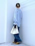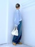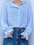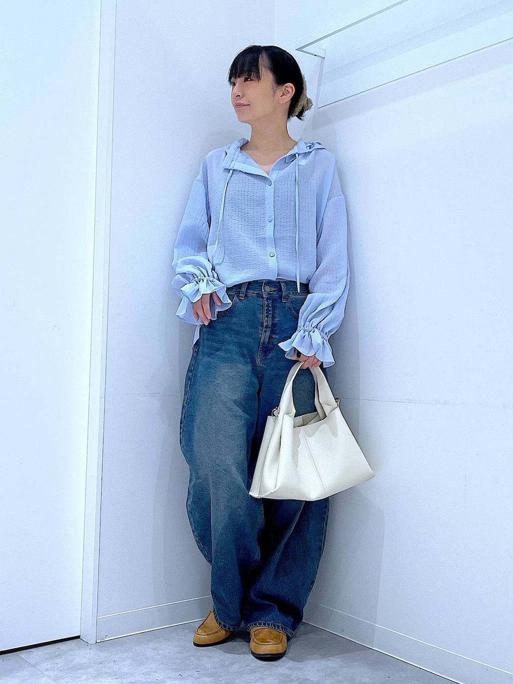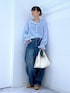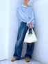甘めブラウスもデニムと合わせるとカジュアルに🩵 ご覧いただきありがとうございます** 襟や袖のフリルがポイントのデザインブラウスです✨ 襟元の紐は垂らしたり結んだり、気分によって変えてみるのもオススメです🫰🏻 【パッと選んでサッと着てシュッと出かける】 各アイテムのアップ画像や全角度、動画も載せています☺︎ ぜひお試しください**