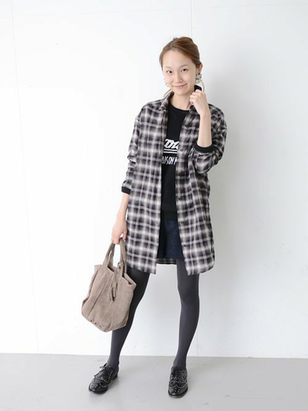 予約中のチェックシャツチュニックを軽い羽織に♪チェック×ツイードパンツは色をまとめて統一感を。