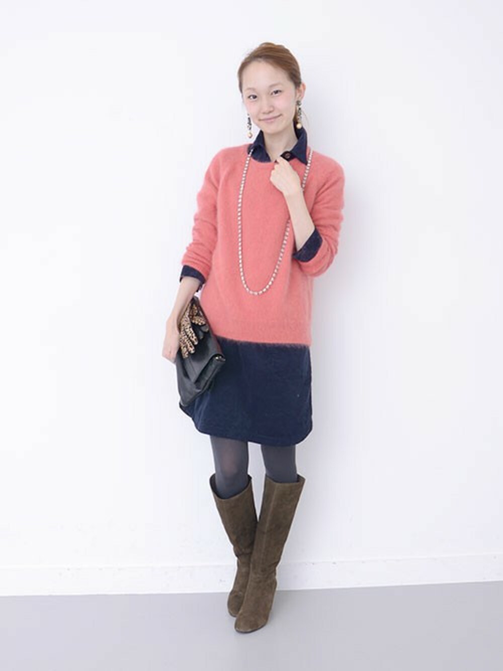 着回し力の高いコーデュロイワンピース。ピンクを差してふんわりと女子っぽく。