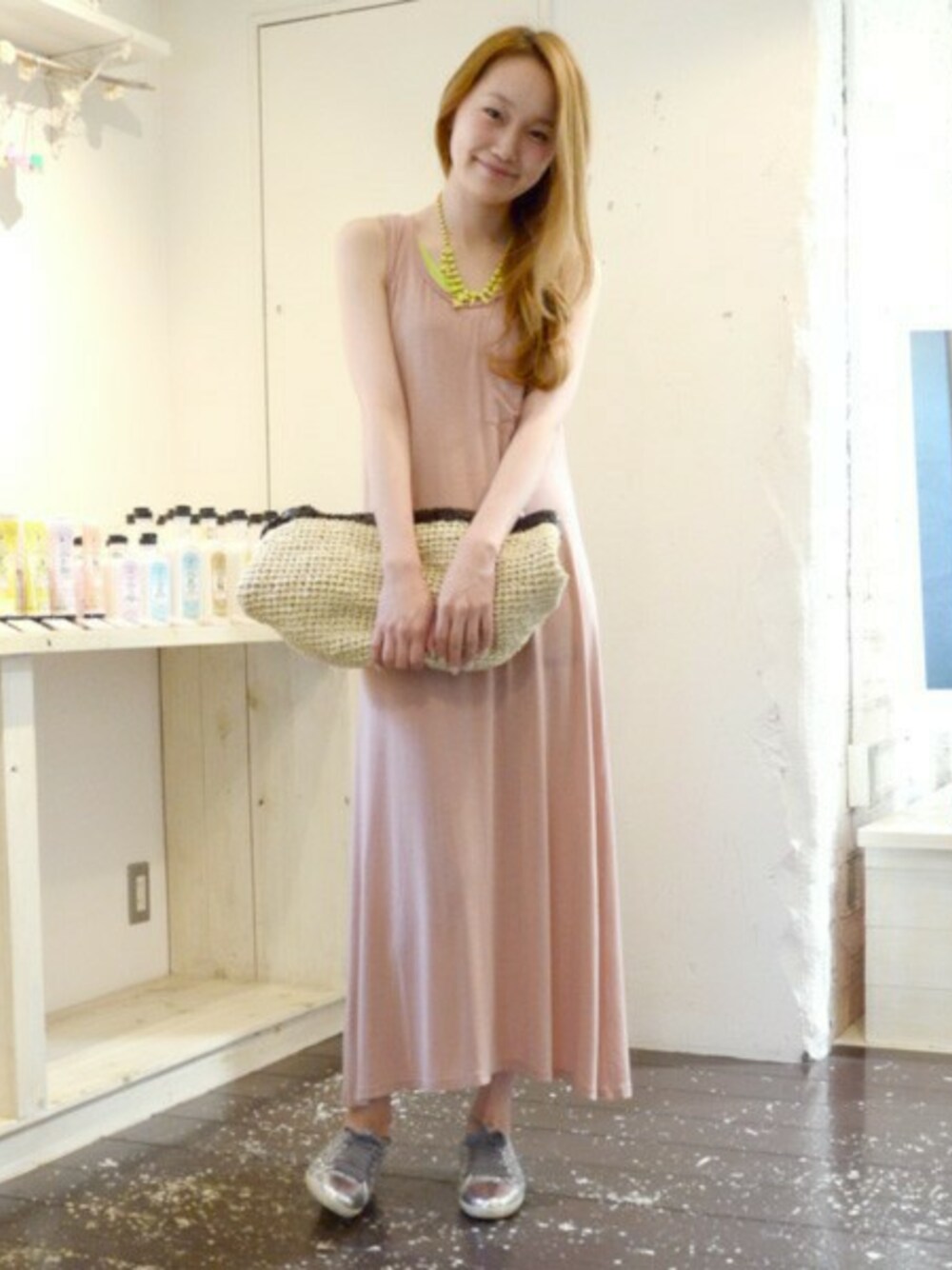 着心地の良いマキシワンピをサラっと一枚で着ました。スパンコール使いのBAGがアクセントになってくれます。