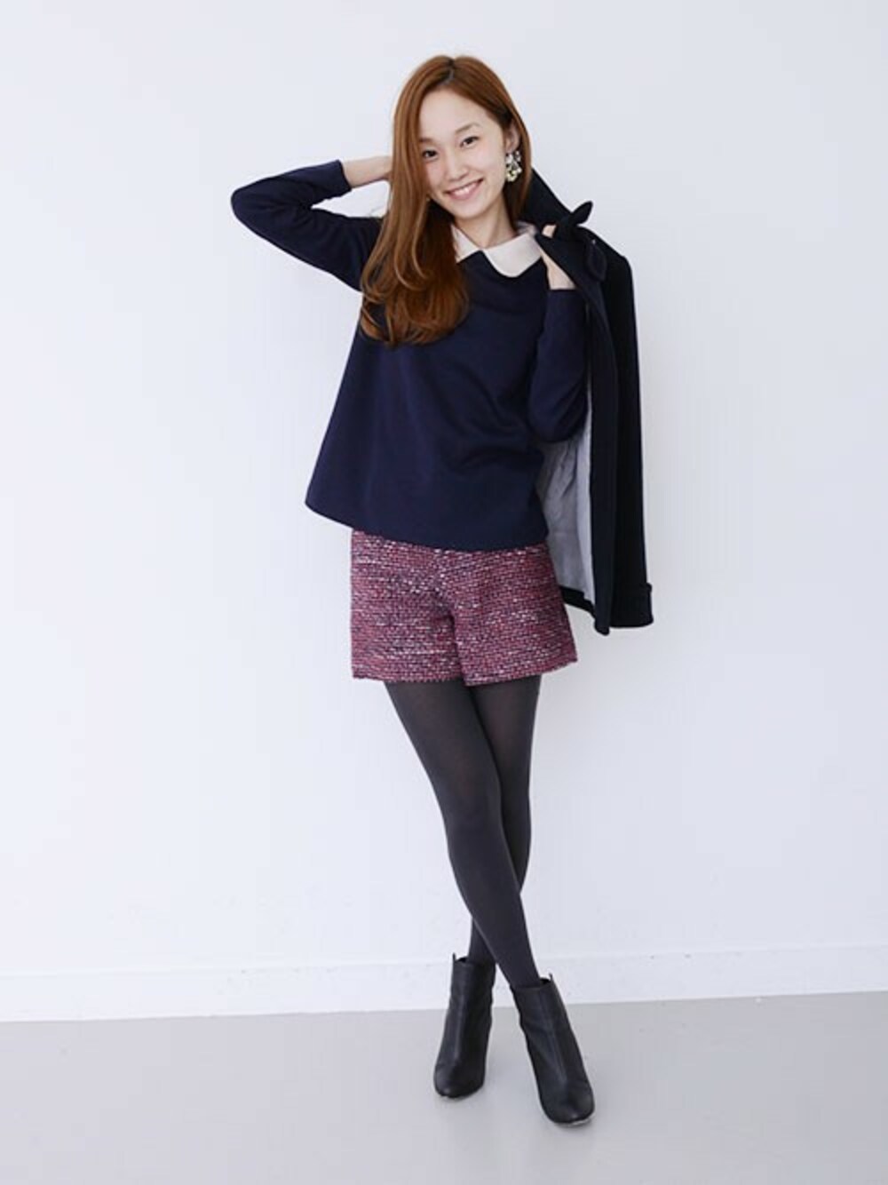 ツイード×衿付きのクラシカルなイメージのアイテムを、程よくカジュアルダウンさせました。