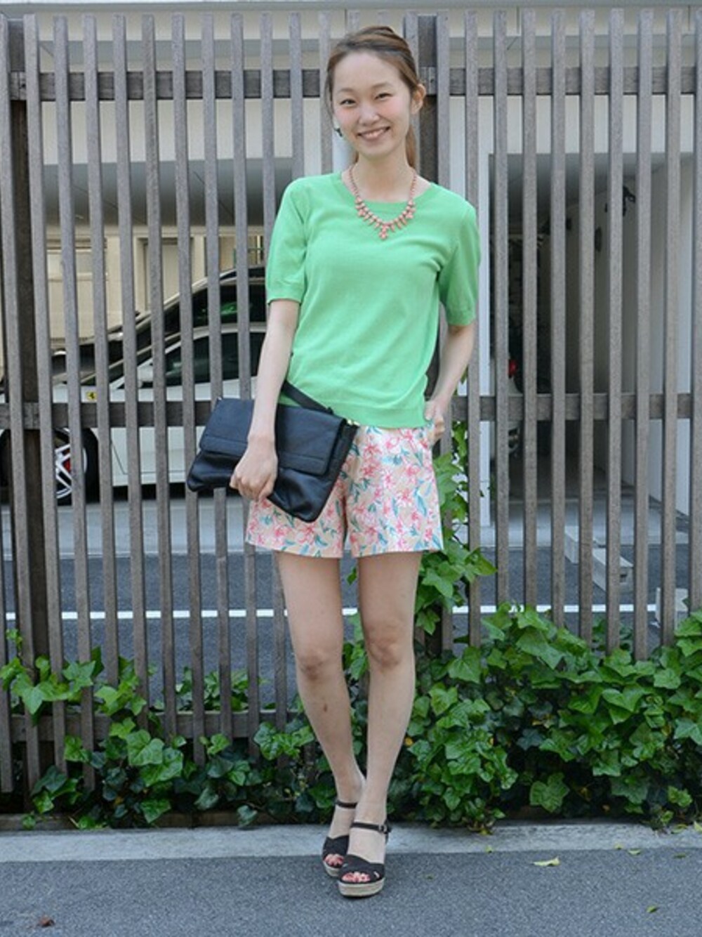 プリントが目を引くショートパンツにシンプルなニットを合わせました。色を挿して今年らしいスタリングの完成♪