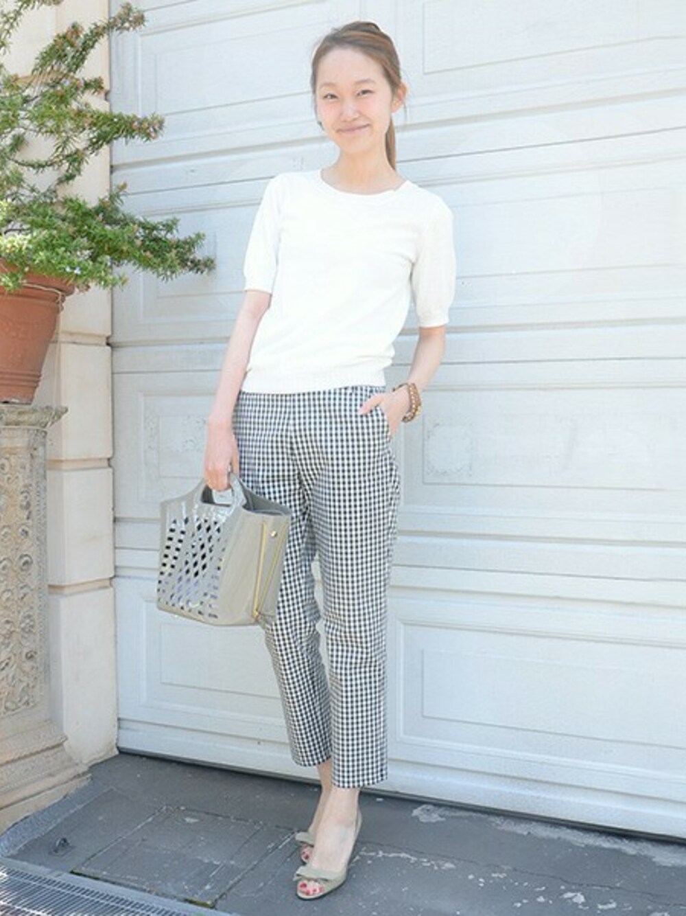 淡いトーンでまとめて、キレイ目だけどかっちりとしすぎないように意識しました。小物の色も合わせて統一感を。