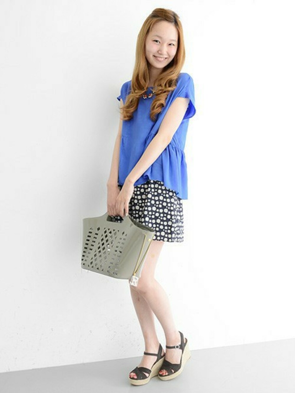 ドットが甘くならないようブルーで引き締めて。足元はヒールで女性らしさをアピール。