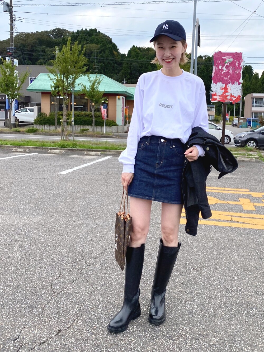 デニムのセットアップ風のコーディネートにシンプルな白のロンTをインナーに合わせて、抜け感を🕊🕊 💐Instagram →m_ooo💐