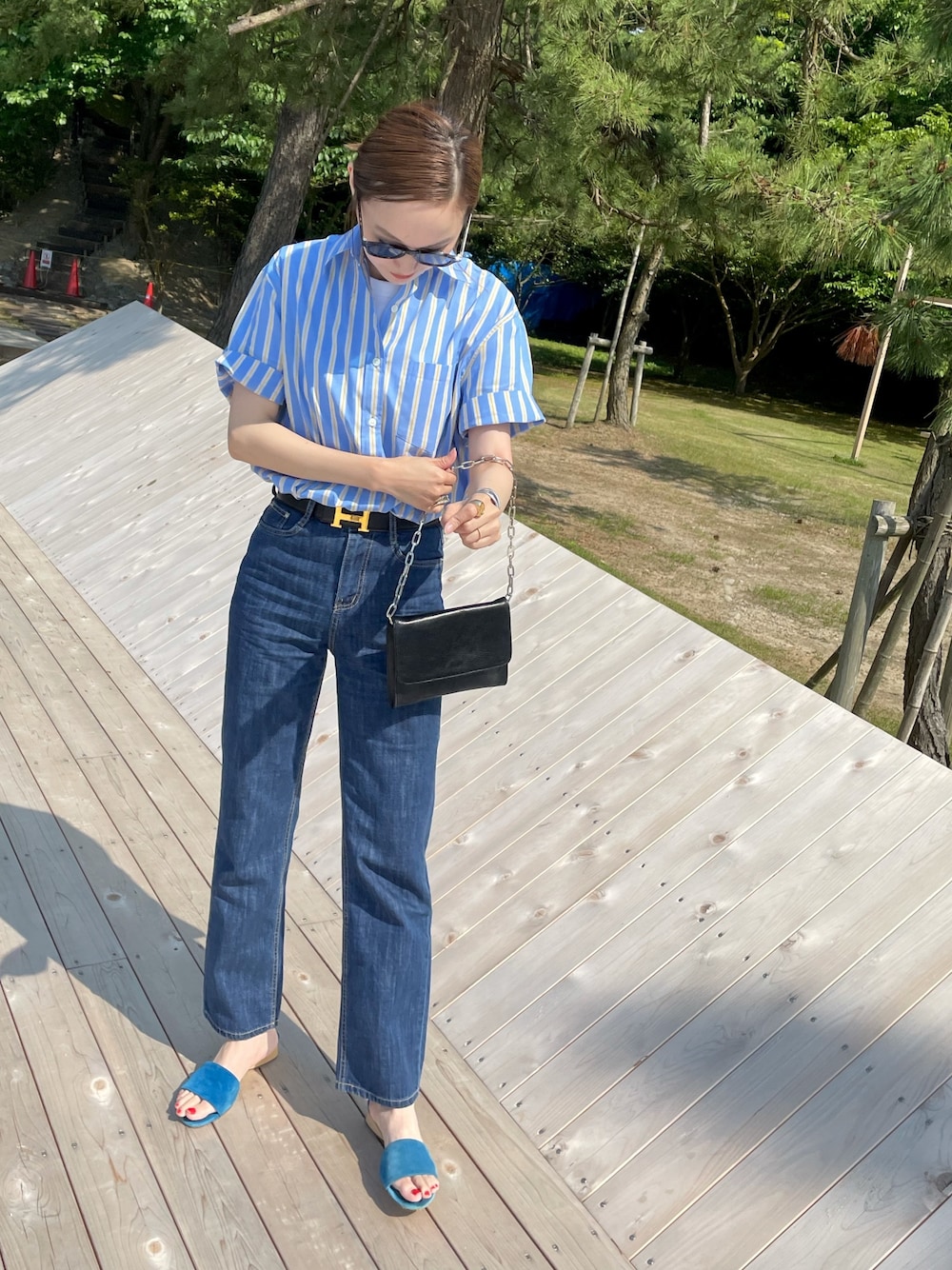 ブルーの半袖シャツにデニムとフラットサンダルを合わせて大人カジュアルに👖👖 💐Instagram →m_ooo💐