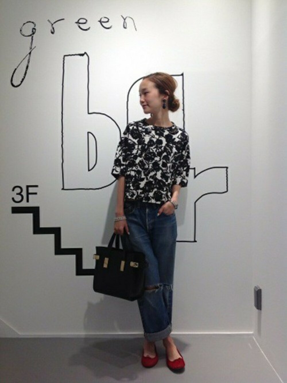 モードな雰囲気のカモフラ柄のスウェットは、落ち着いた色身なのでデニムあわせでも カジュアルすぎず◎ バッグもモノトーンで合せて、モードなスタイルに。