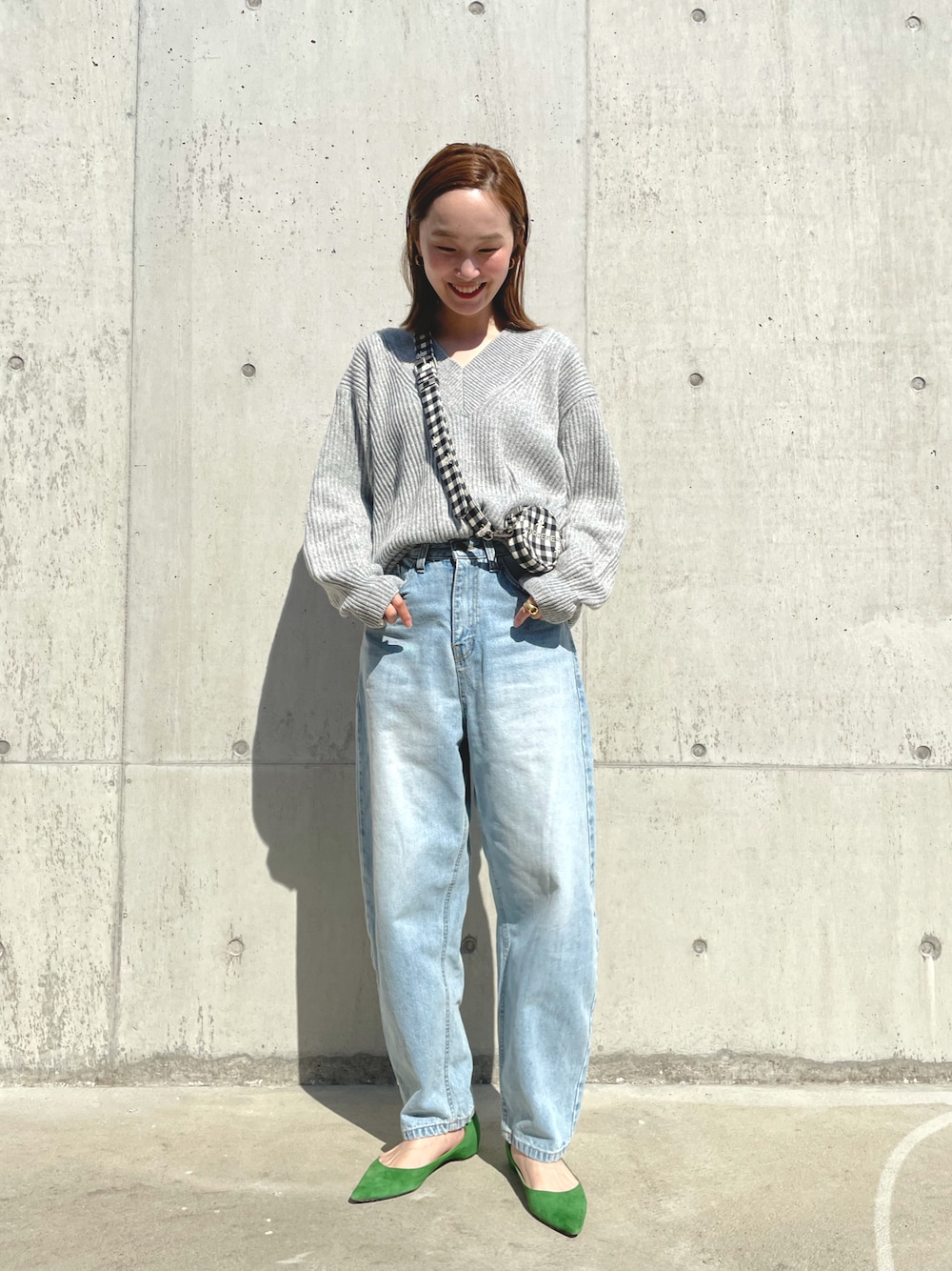 グレーの畦編みのVネックニットをデニムとポインテッドパンプスで大人カジュアルに👌☺️💐💐 🥐🍨🥞Instagram →m_ooo