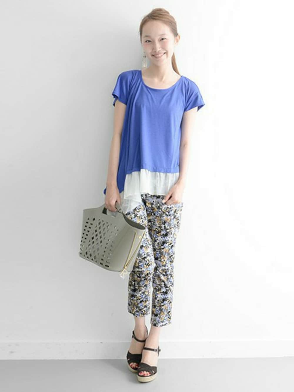 パンツが華やかなのでトップスは軽い素材を選びました。裾のシフォンとブルーの組み合わせで涼しげな印象に。