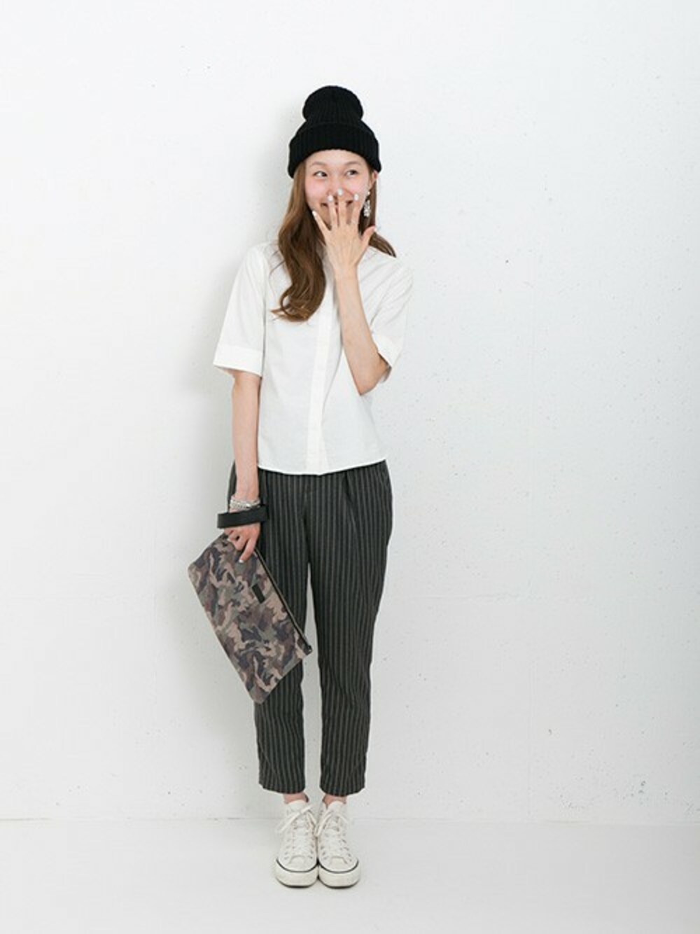 ボックスシルエットのシャツはラインが綺麗なので一枚でシンプルに。ストライプパンツでもマニッシュになりすぎないよう、ニットワッチやハイカットのスニーカーで着崩しました。