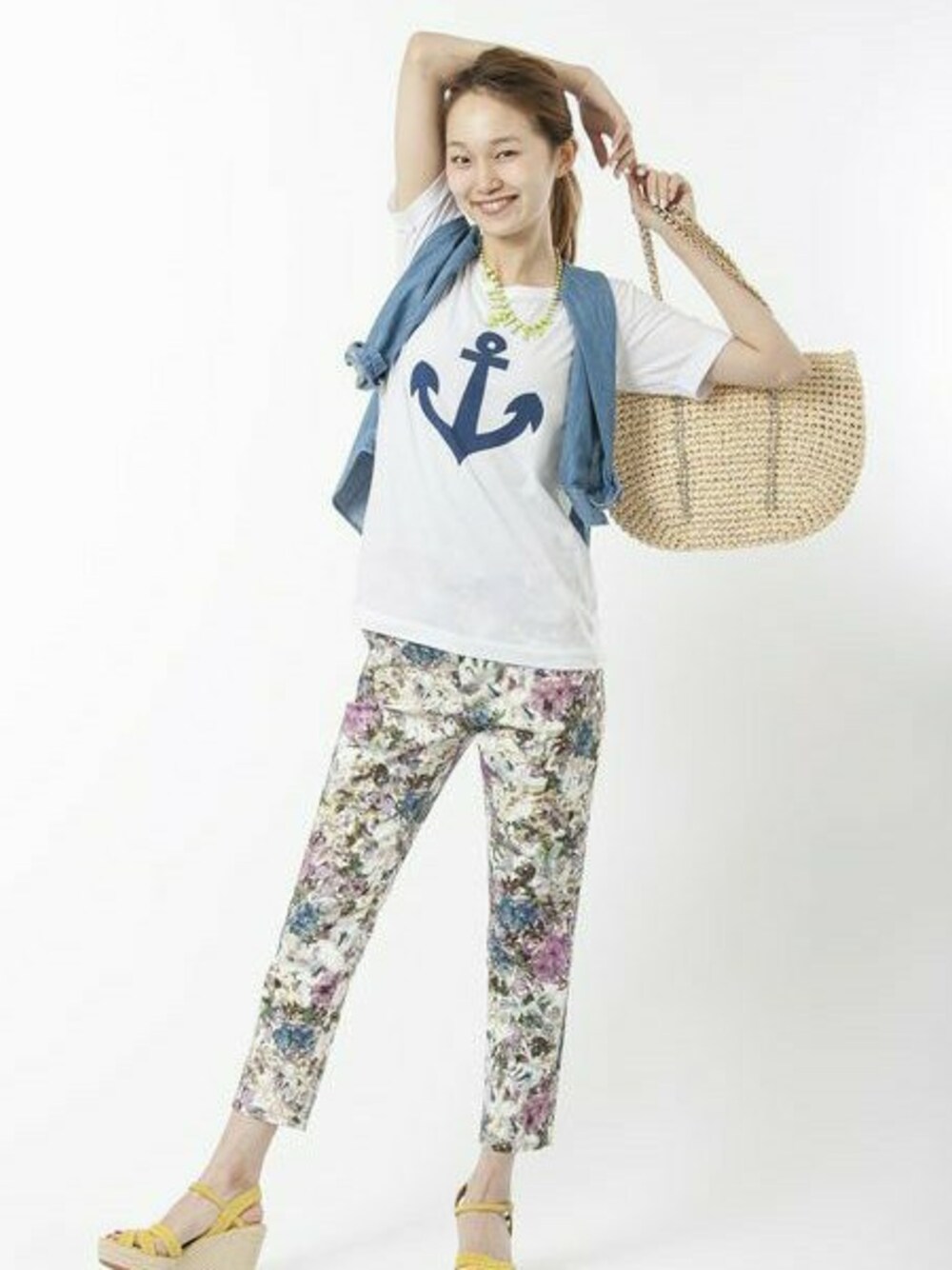 マリンテイストのTシャツに旬のプリントパンツを合わせてトレンドをプラスしました。