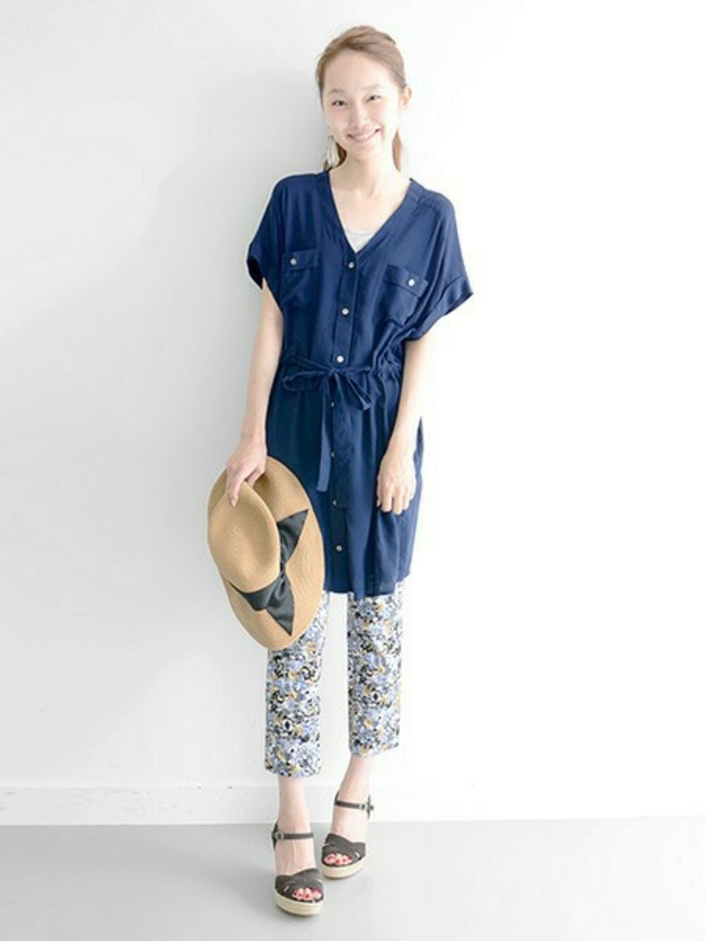 ワンピースのウエストをキュっと絞ってチュニック感覚で。ワンピースと小物をシックなカラーで統一してプリントパンツで華やかさをプラスしました。