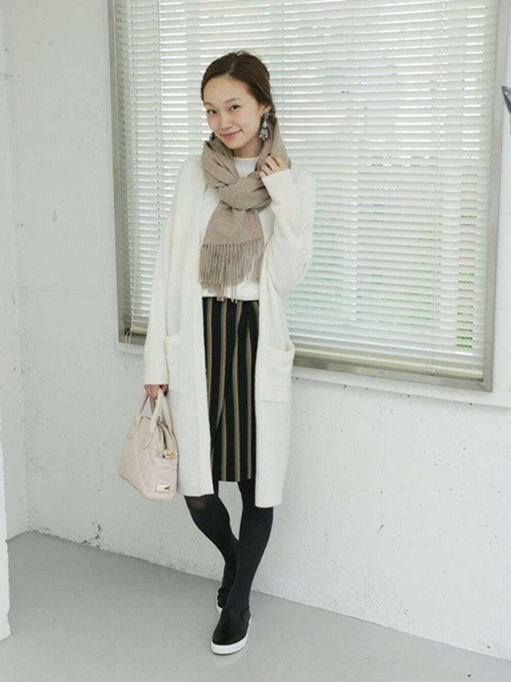 大判ストールはカシミヤ素材で肌触りの優しいものを。オフホワイト×ベージュの柔らかなトーンに、キャッチーなストライプを差して引き締めました。