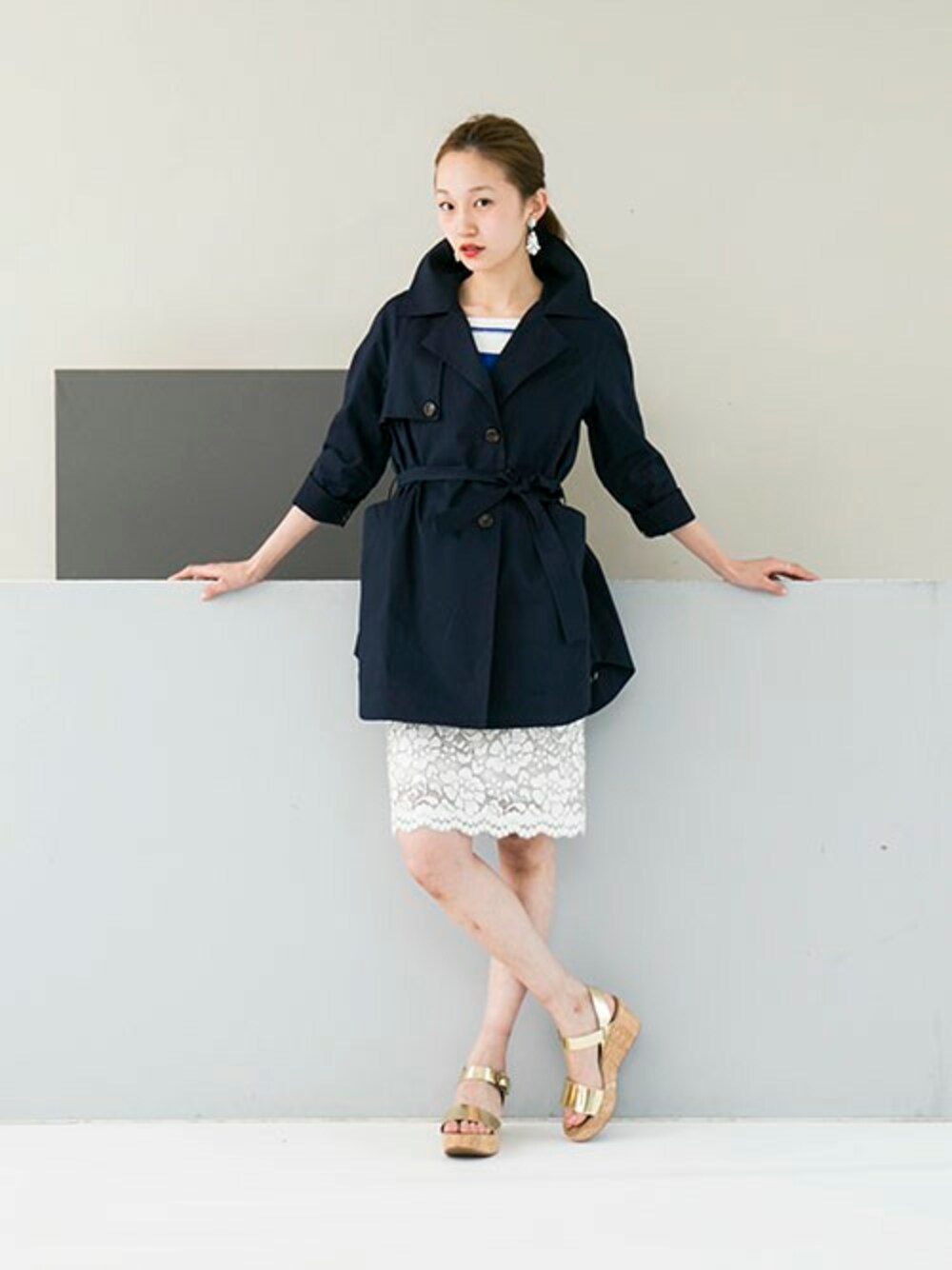 春アウターの代名詞のトレンチコート。レースのスカートは清涼感のあるホワイトを選び、着丈のバランスを整えて女性らしくまとめました。 outer:URBAN RESEARCH skirt:URBAN RESEARCH(3月中旬頃入荷予定) shoes:FABIO RUSCONI(2月中旬頃入荷予定)