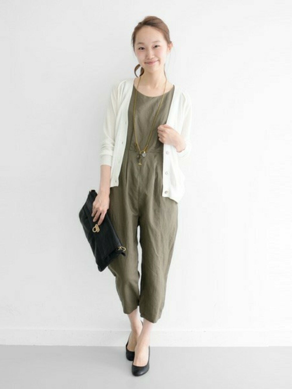 小物をモノトーンで統一して、コンビネゾンを大人っぽく。リネン素材で程よい抜け感を演出できます。