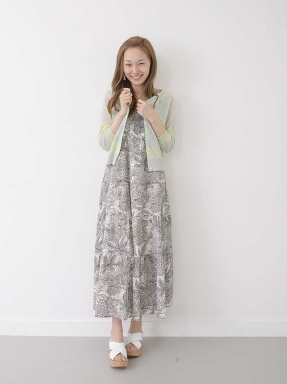 プリントのマキシワンピにチェックカーデを。色味が柔らかいので、柄×柄も可愛く決まります。 tops:URBAN RESEARCH one-piece:URBAN RESEARCH(4月予約予定) shoes:FABIO RUSCONI