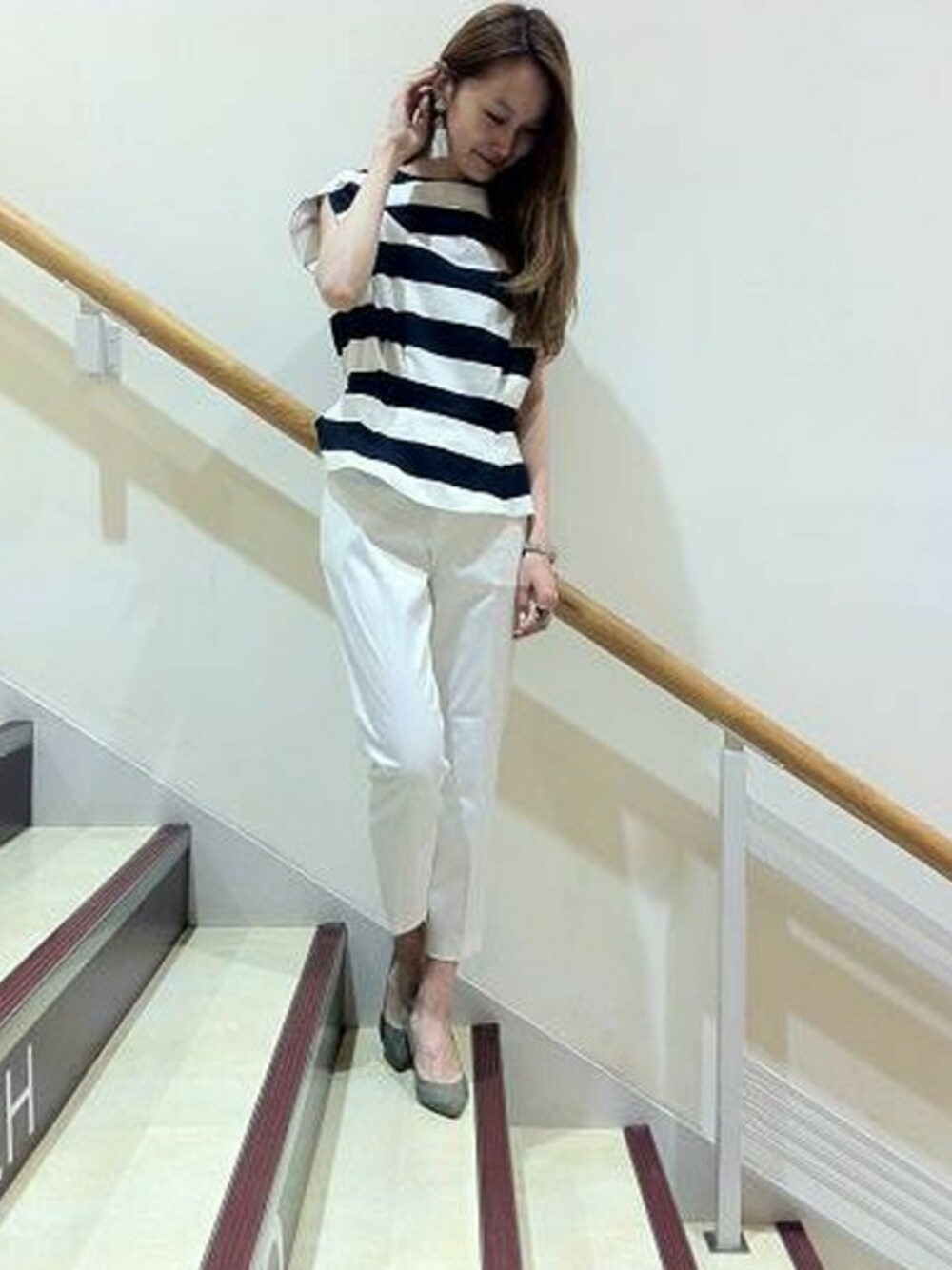 ペプラムシルエットのブラウスには、テーパードタイプのすっきりとしたパンツを◎ パンプスを差し色にしました