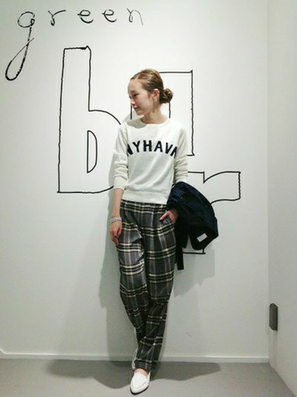 ロゴの入ったニットをメインにカジュアルなスタイリングに◎足元もニットの色に合わせて抜け感を