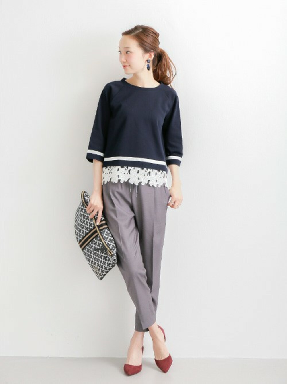 スポーティテイストな旬のトップス。ラインの綺麗なパンツに合わせ、パンプスで綺麗にまとめました。