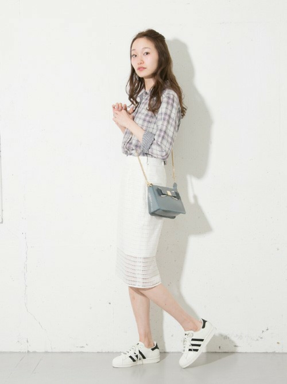 透け感が今年らしいレースのスカートにチェックシャツをインさせて、デイリーカジュアルに。足元はスニーカーで◎