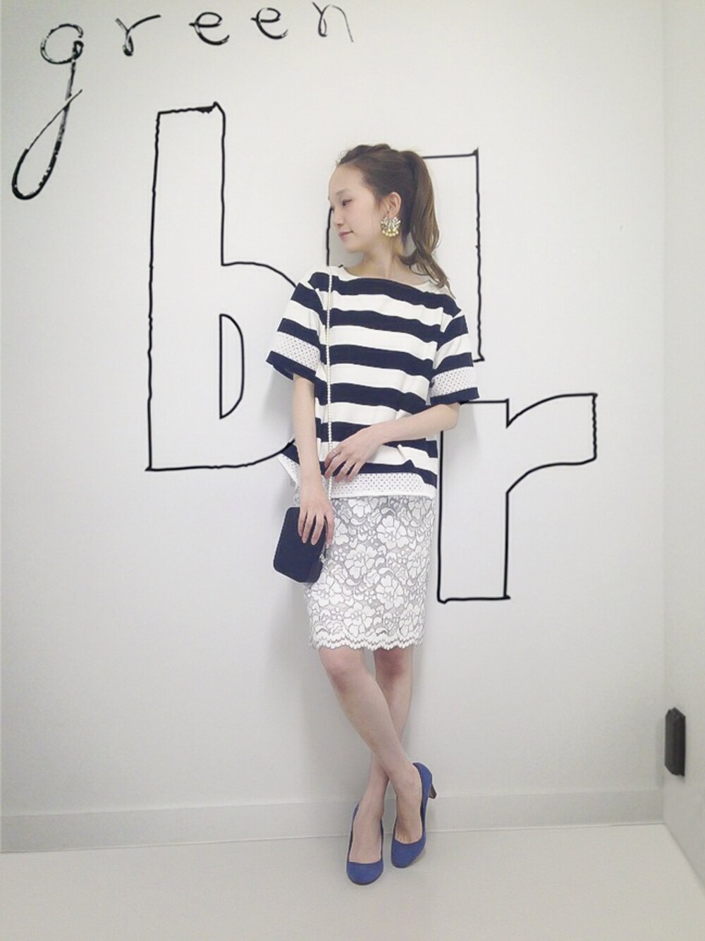 ワイドピッチが今年の気分にピッタリのボーダートップスはさり気なくレース使いが☆スカートはタイトにヒールパンプスでスタイルアップを。