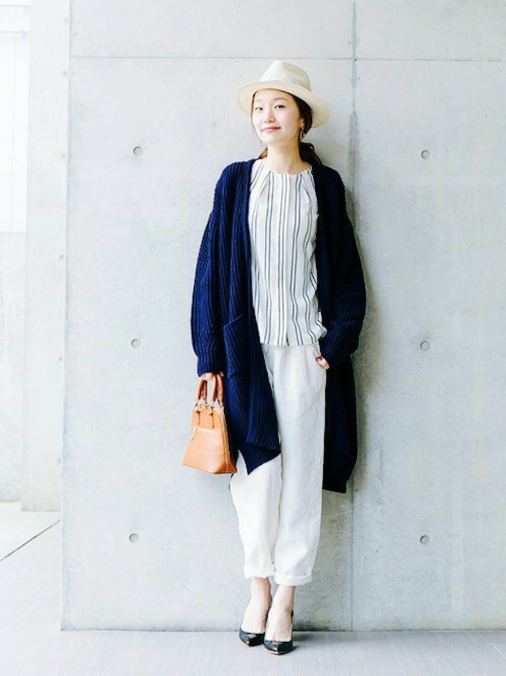 tops:URBAN RESEARCH ノースリーブランダムストライプブラウス ¥8,640(tax in) 3月下旬予約予定 リネンのパンツにガウンカーディガンのリラックススタイル。インナーにストライプがナチュラルすぎないようにうまくまとめてくれます。