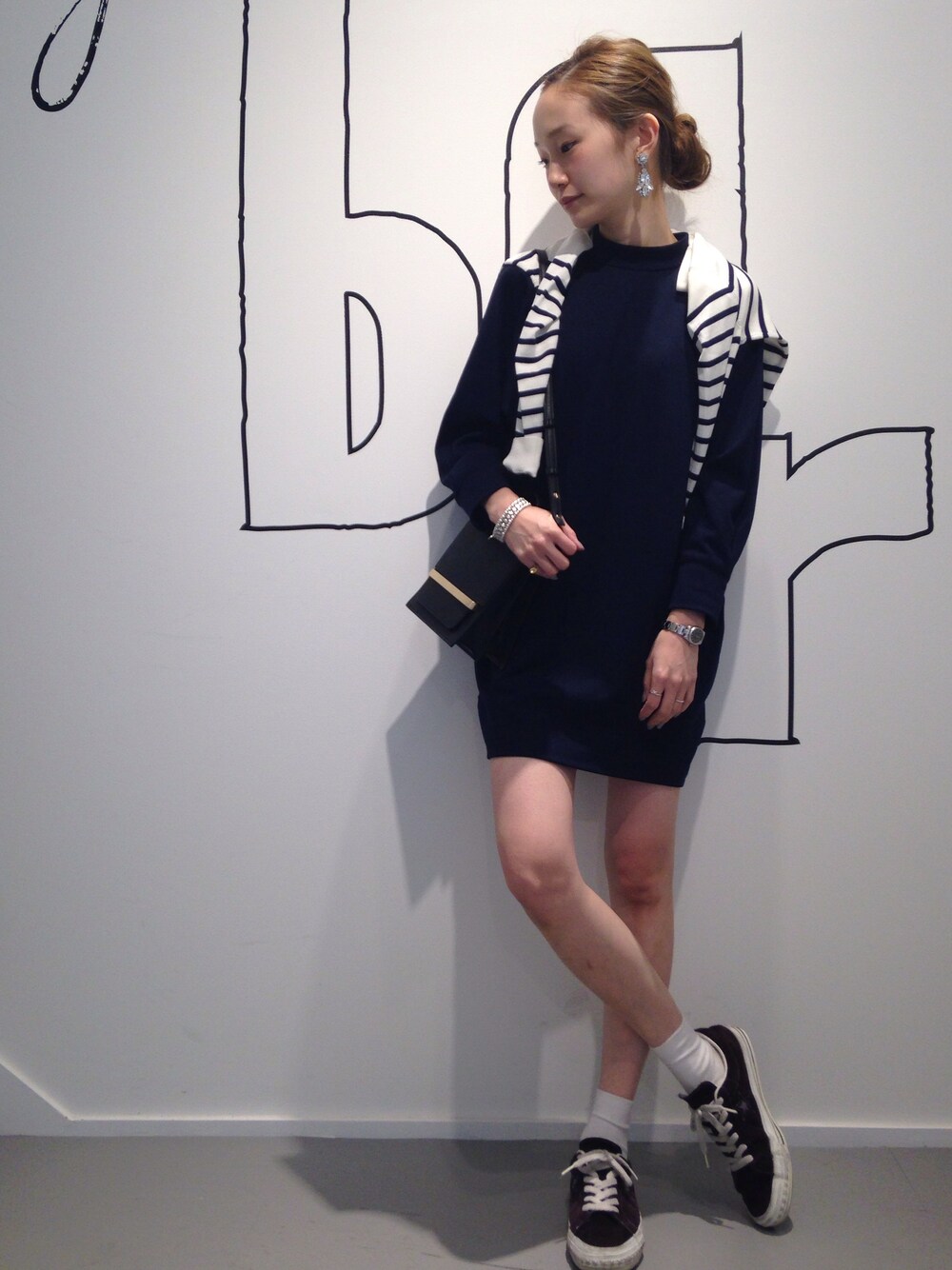 スウェットワンピースにローカットスニーカーでカジュアルに◎ボーダーカーディガンがアクセントに。