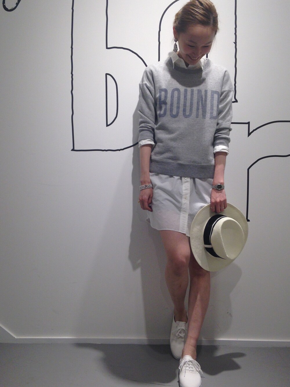 白シャツに白のハット、スニーカーも白で統一して爽やかに◎ヘアーもまとめて、ビジューイヤリングをポイントに。
