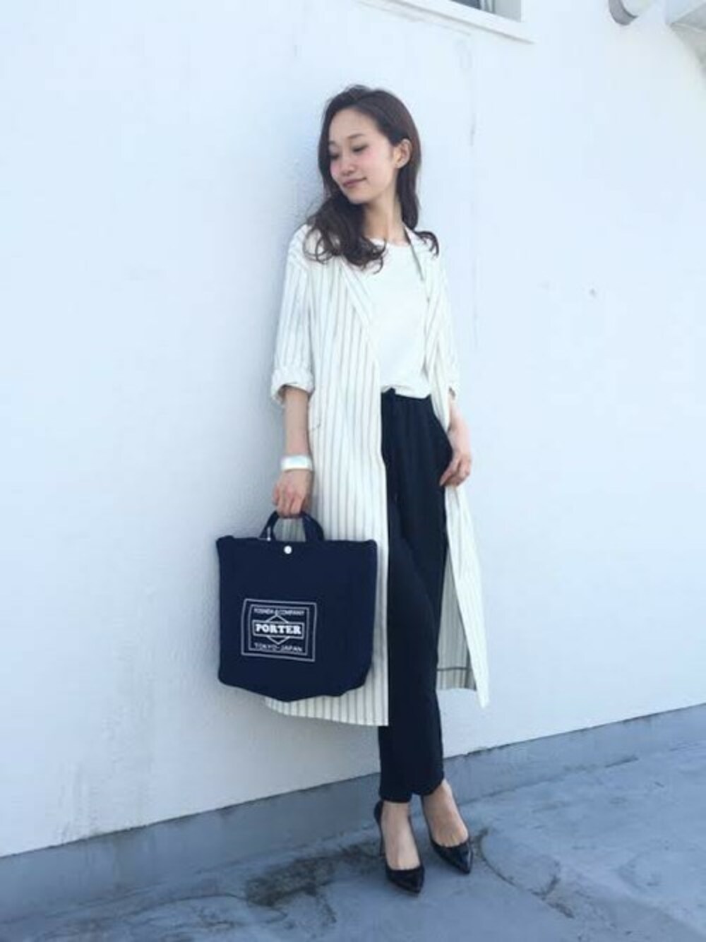 マキシ丈のコートはモードになりすぎないよう、ルーズなパンツとキャンバスBAGで外しました◎足元はヒールでカジュアルになりすぎないように。