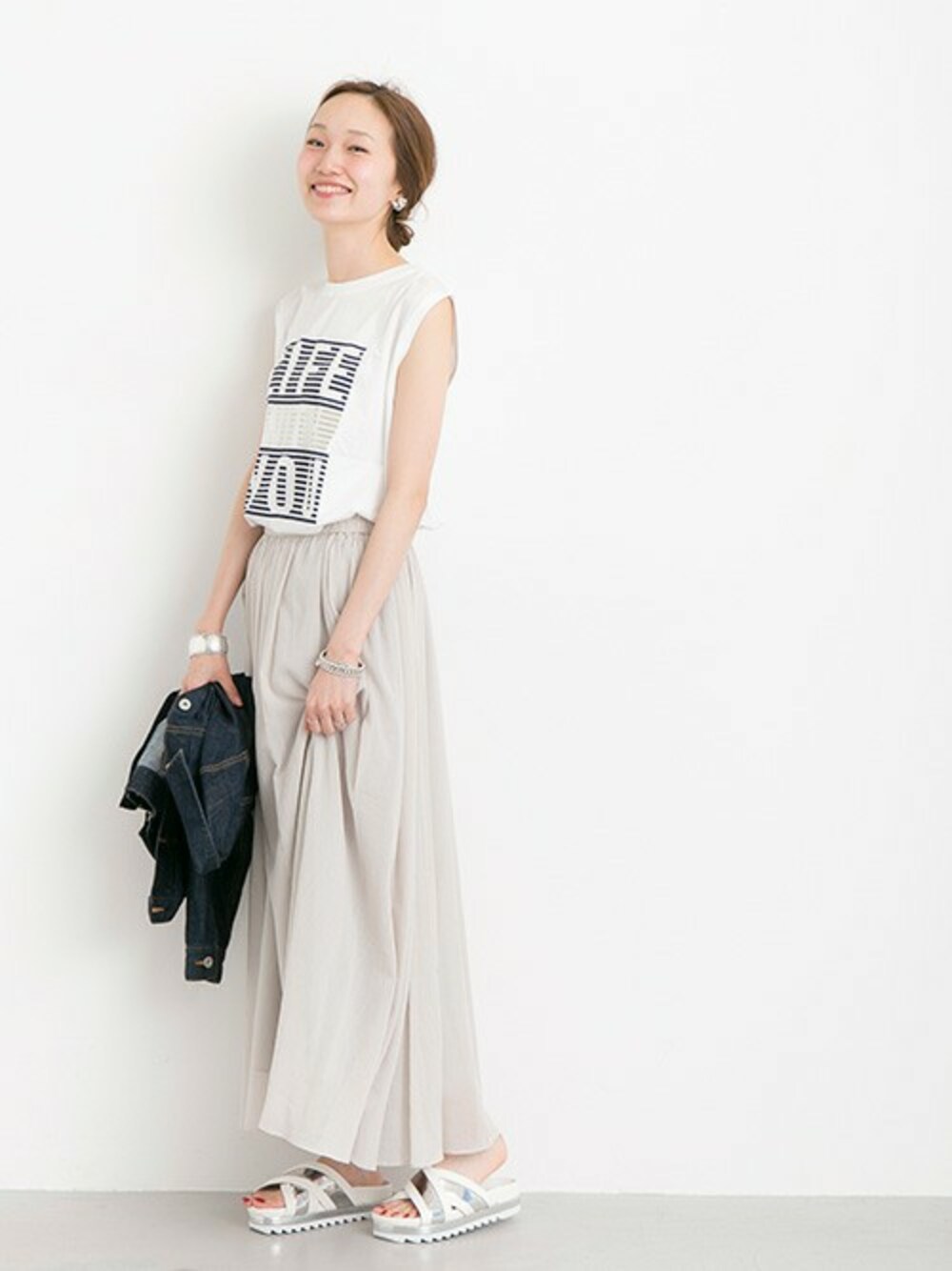 マキシスカートにナチュラルにならないよう、メタリックなプラットフォームサンダルにシルバーアクセでアクセントを。トップスはタックインが◎子供っぽくならずに着こなせます。