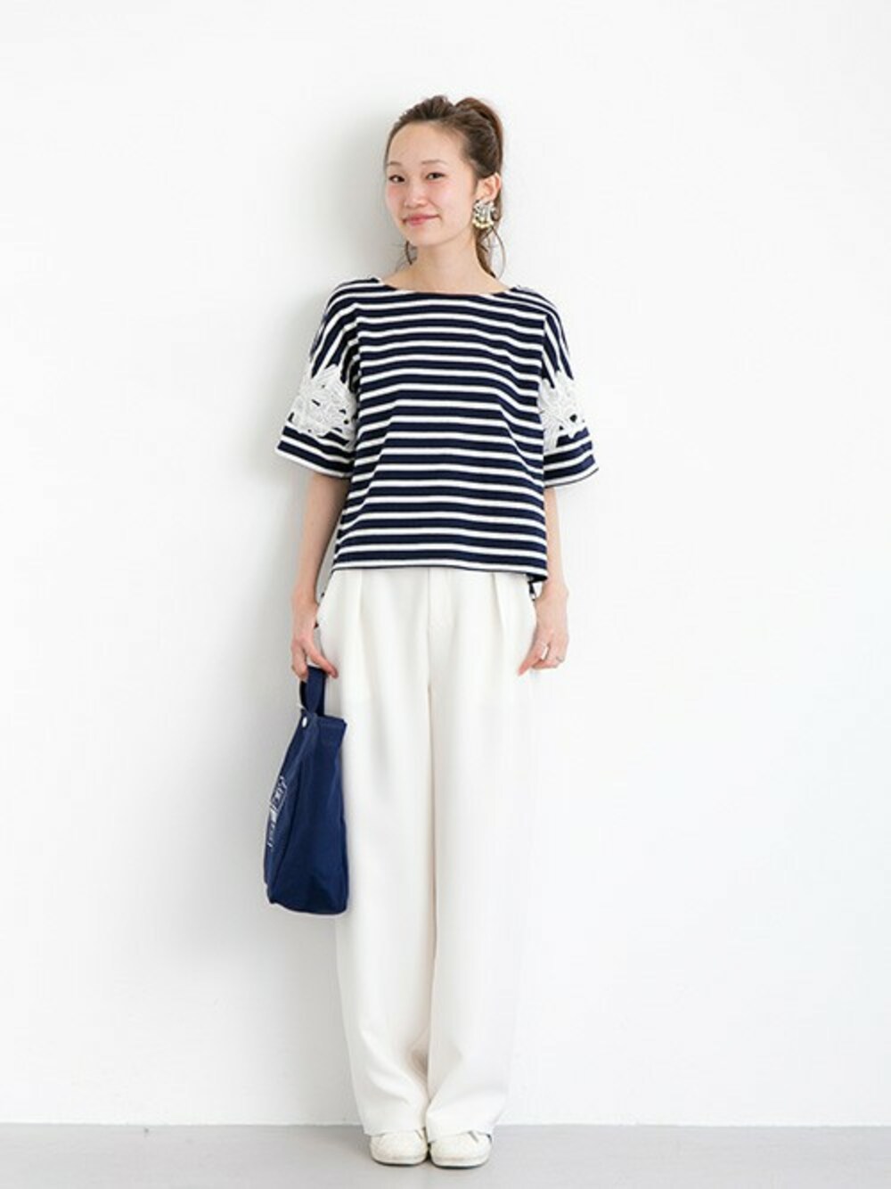 tops:UR 袖レースボーダープルオーバー ¥8,964(tax in) 5/1予約予定 ホワイトのワイドパンツはお気に入りの一本。ボーダートップスのシンプルコーデですが、レース使いがポイントで子供っぽくならずにまとまります。 ストンと落ちるIラインでスッキリとまとめました。