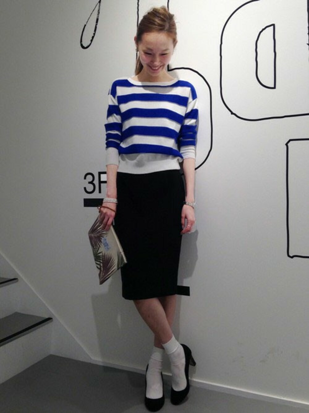 ボーダーニットもペンシルスカートで少しだけキレイめに◎アロハ柄クラッチをポイントに