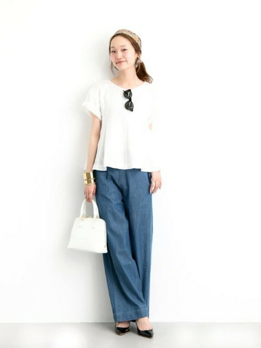 ワイドシルエットが気分にぴったりなデニムパンツ。清涼感のあるホワイトトップスで爽やかにまとめつつ、ボリュームアクセでポイントを。