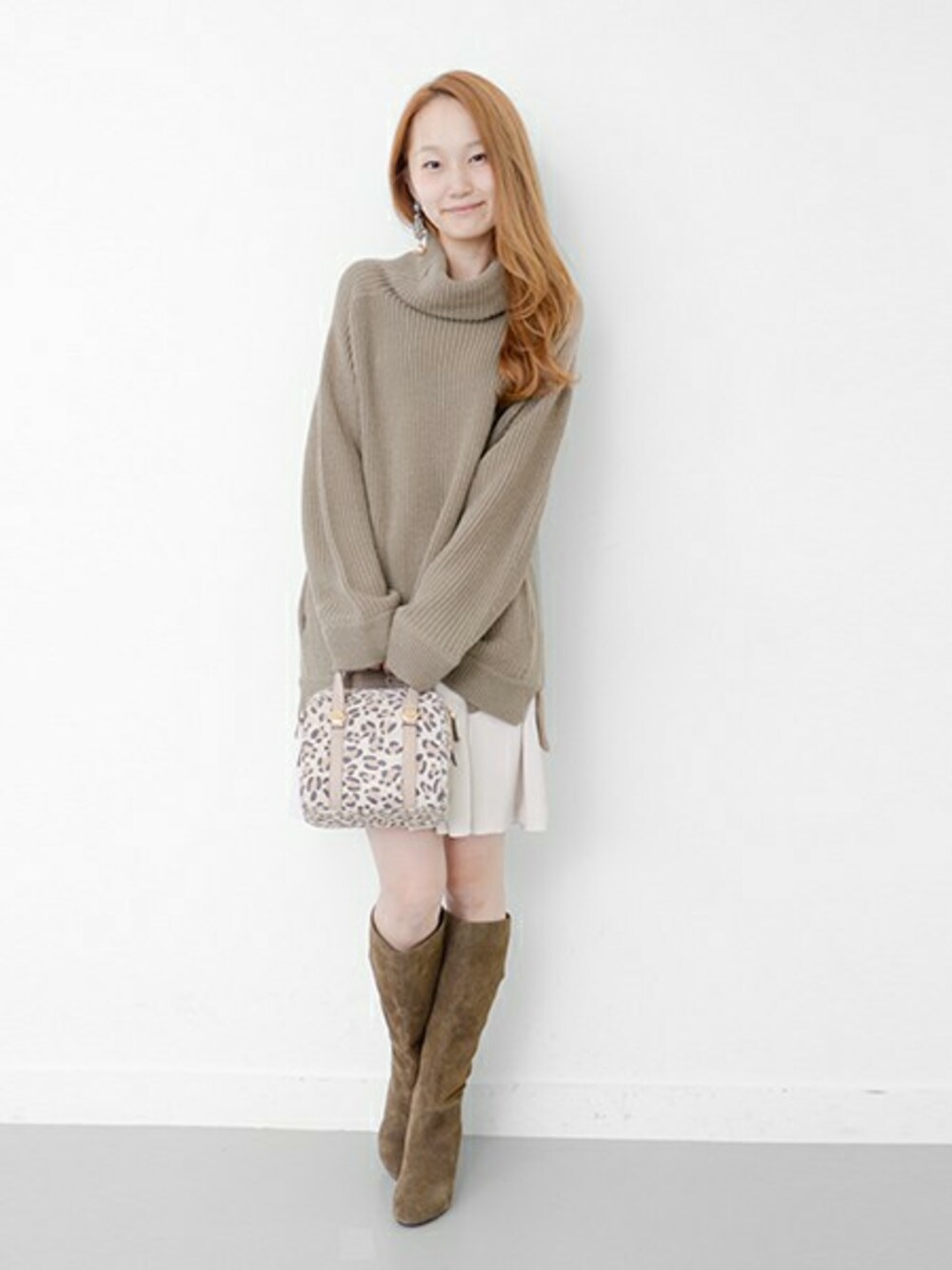 ズルっとしたルーズシルエットのニットからスカートをのぞかせて。色のトーンをまとめてカジュアル過ぎない女子スタイルが完成♪