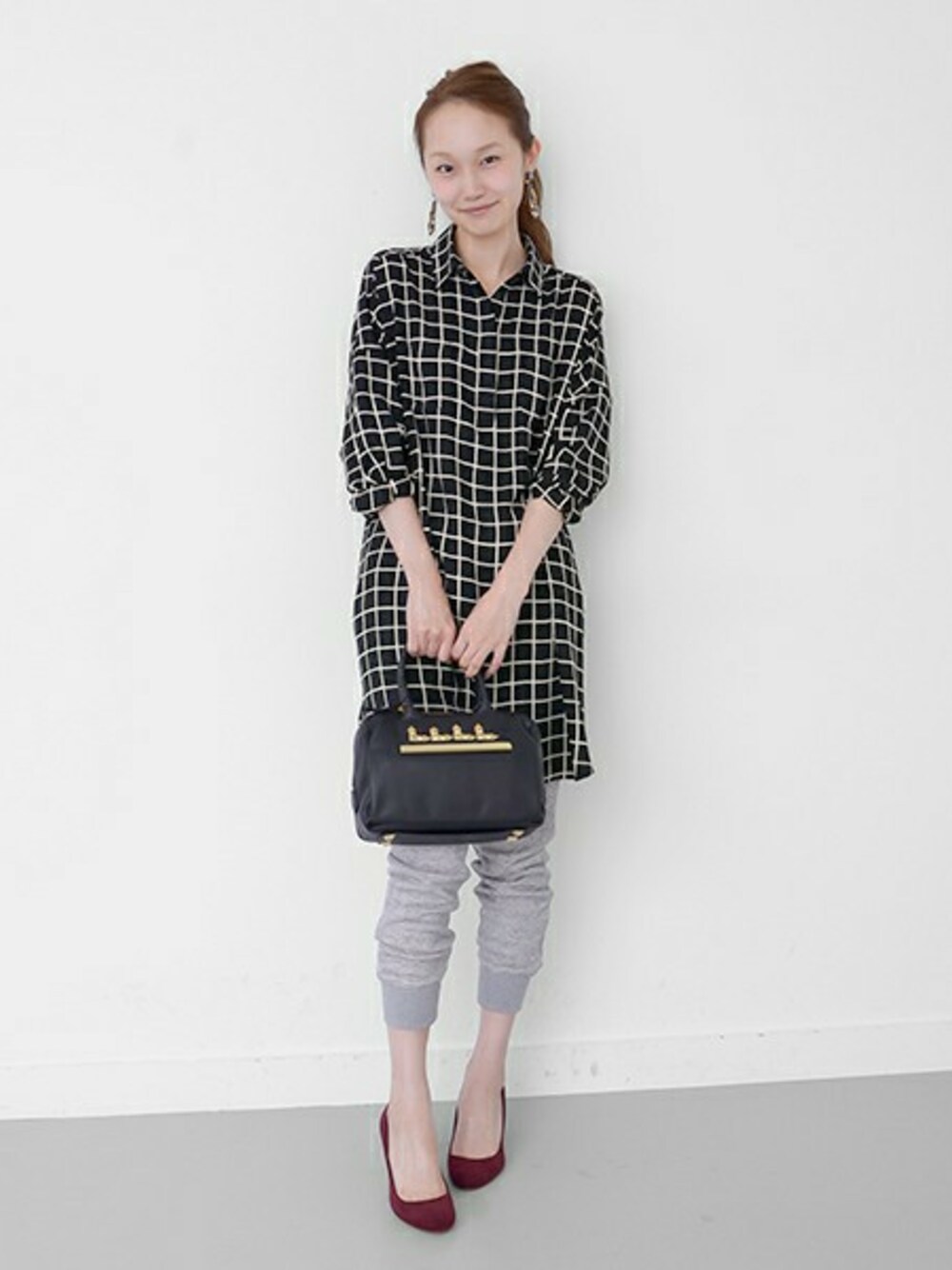 チェックワンピースをチュニック感覚で。スウェットパンツに合わせて、タウンユース仕様に。小物使いもぬかりなく。