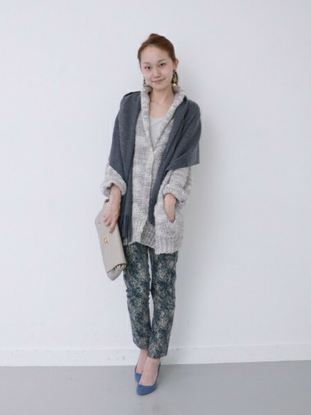 ざっくりとした緩めのニットカーディガンを、前を閉じてルーズなニットプルオーバー感覚で。プリントにカラーを足して遊び心を。