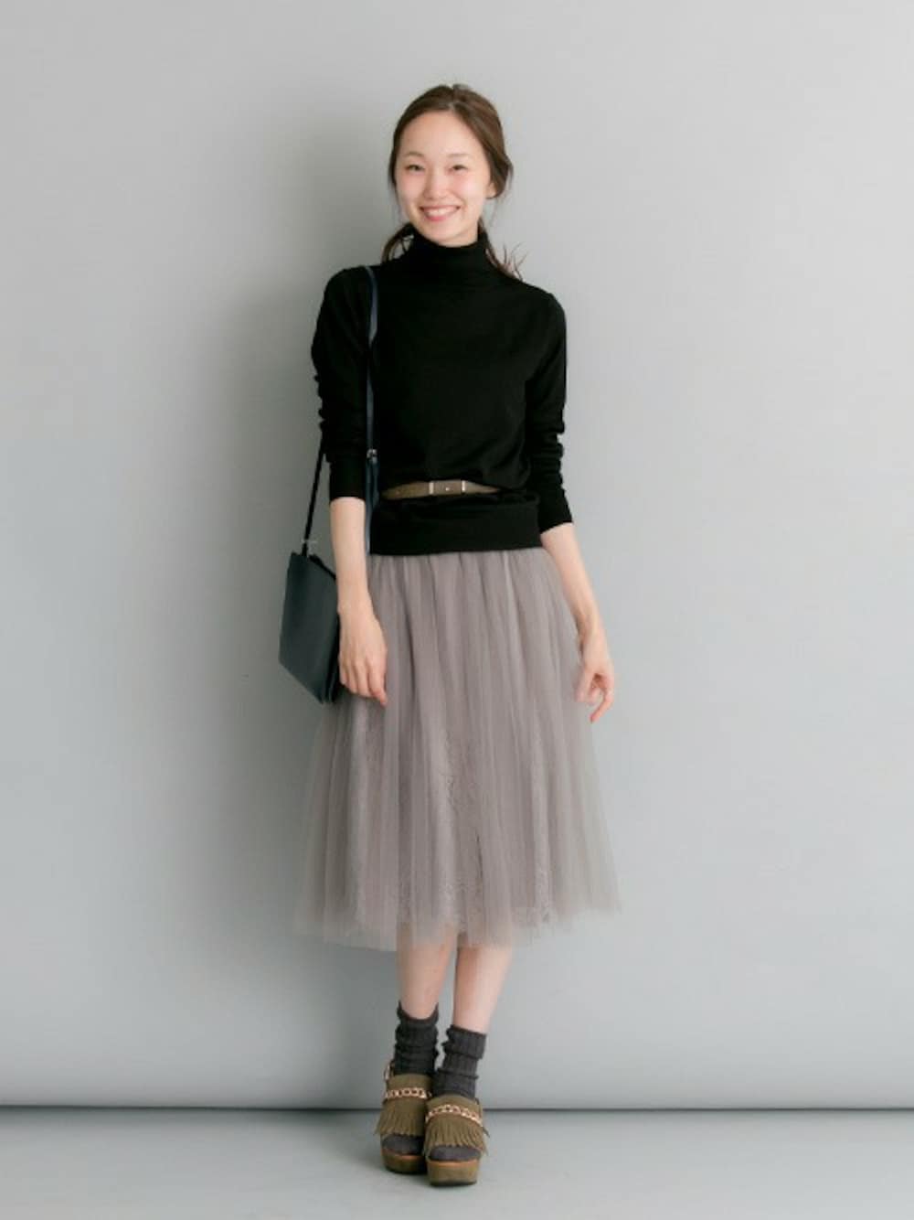tops:UR BASICタートルネックニット ¥8,100(tax in) 9月下旬販売予定 チュールスカートを活かしたシンプルスタイル。ベルト使いやシューズなど小物でトレンドを取り入れてすっきりまとめました◎