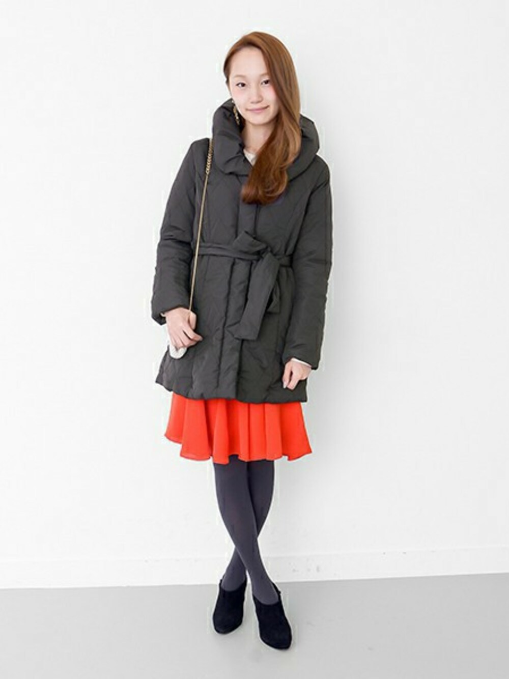 ダウンコートをメインにしたフェミニンスタイル。