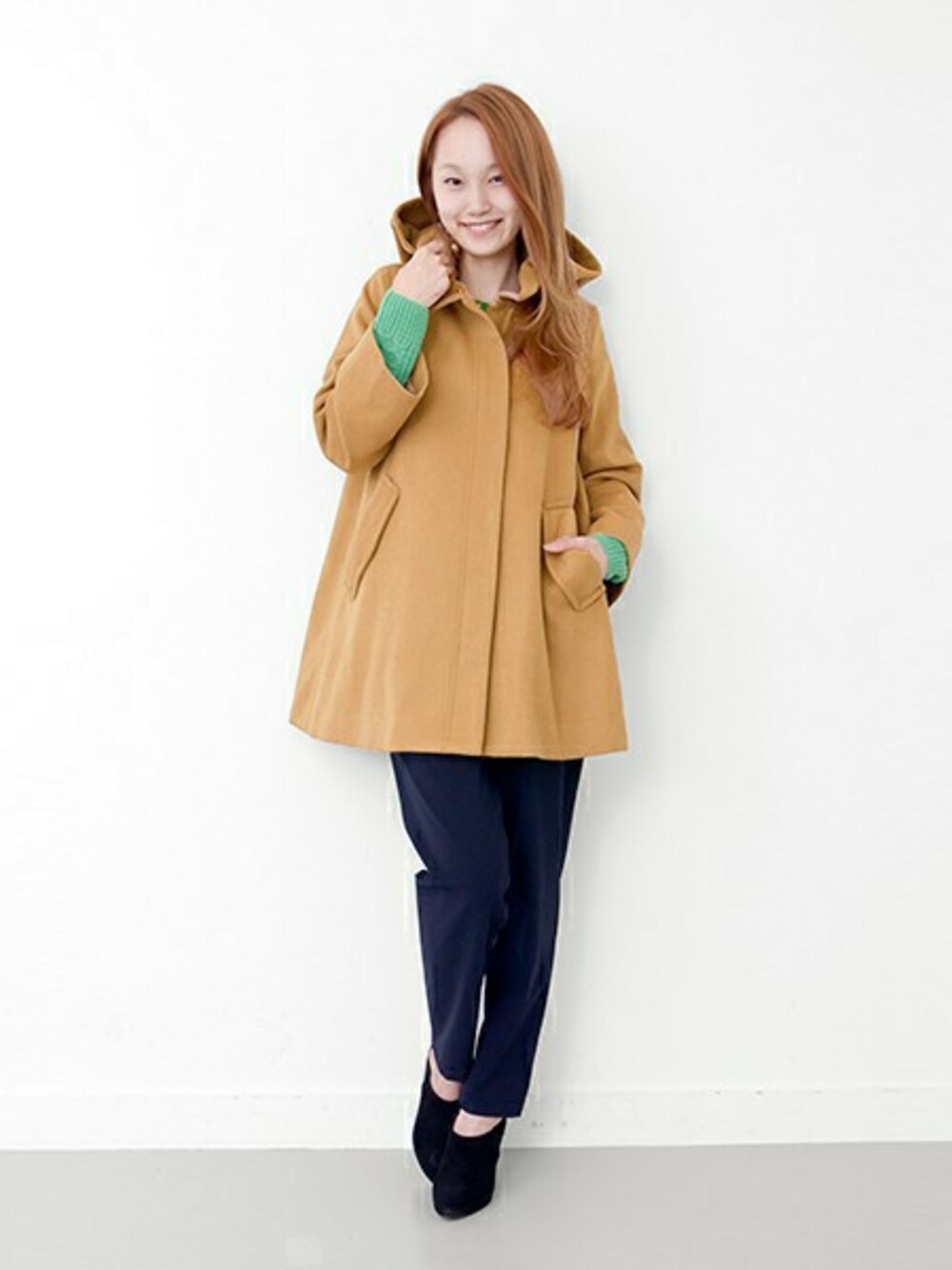 シルエットが可愛いコートを閉じて一枚で。さり気なく色を差してアレンジを。