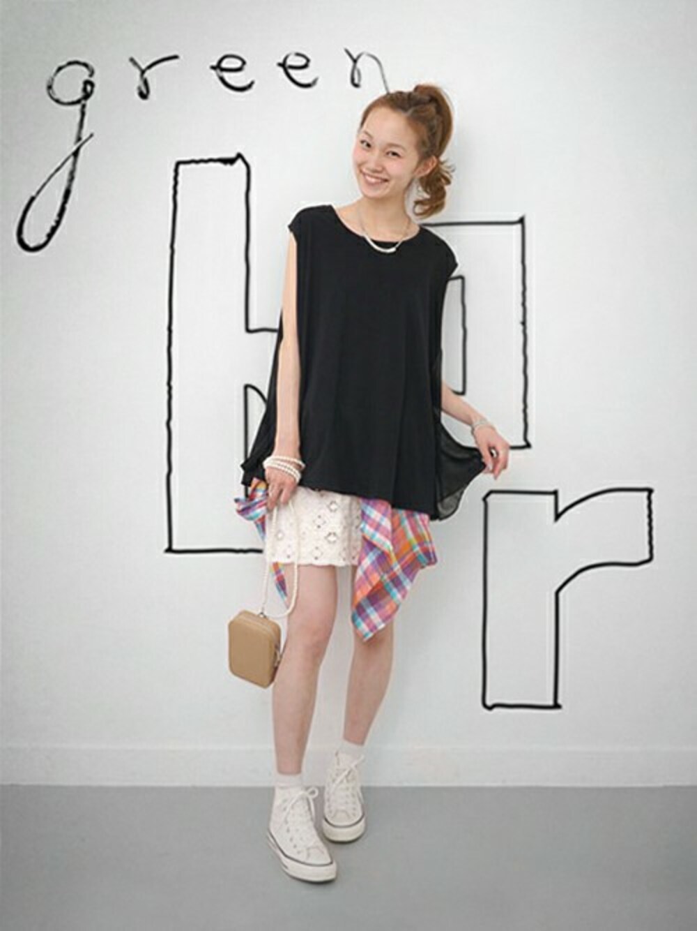 ホワイト×ブラックに、チェックシャツをポイントに。