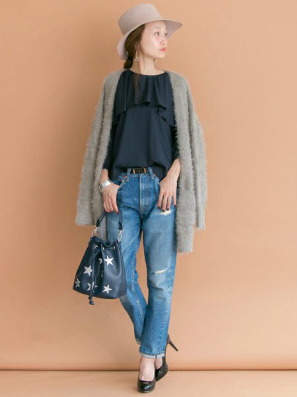 フリルのブラウスにふんわりした素材感のカーディガンを合わせて、柔らかい印象に◎ 甘くならないようにデニムで合わせました。
