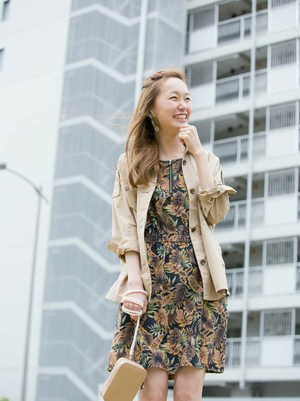 プリントのワンピースにオーバーサイズのシャツジャケットを。衿元を後ろに抜かして抜け感を出すのがポイント。