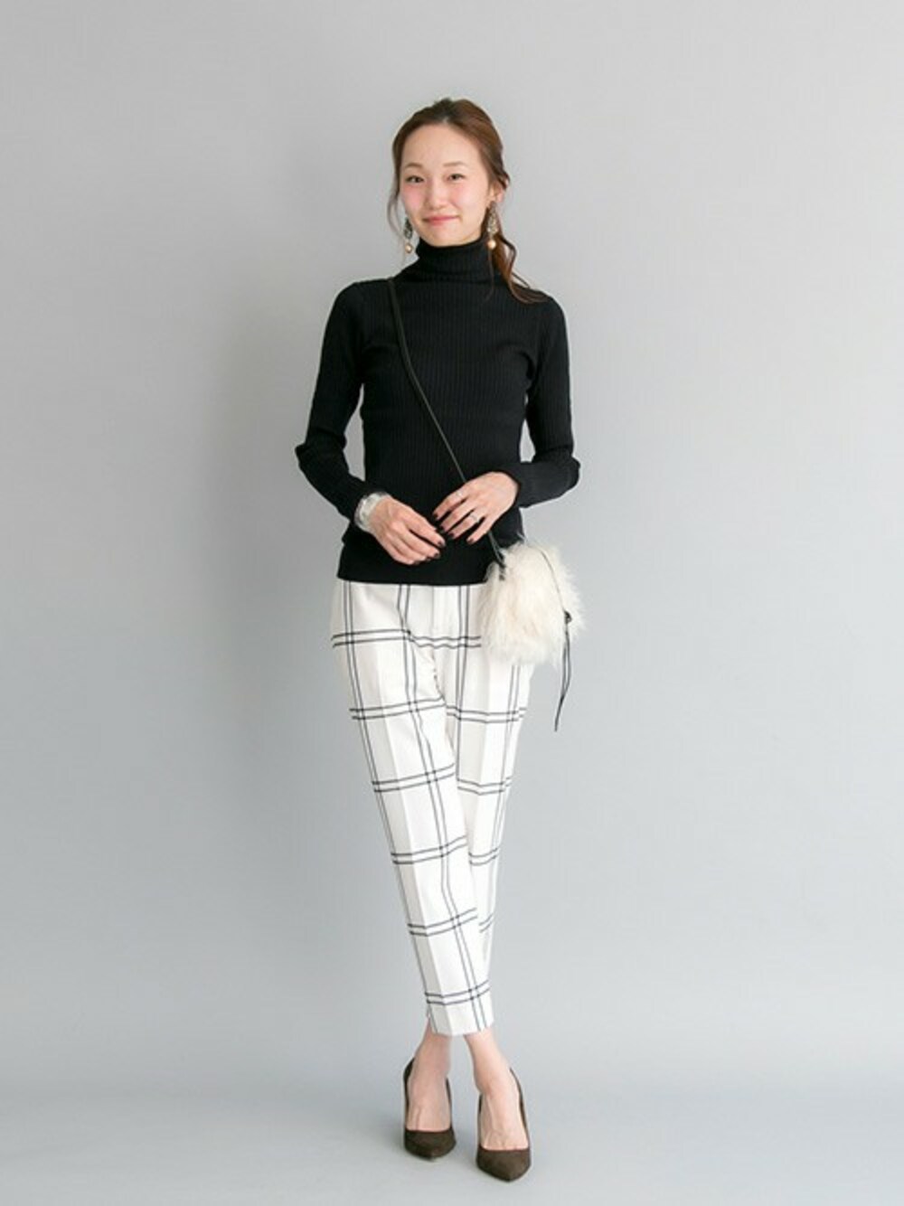 大柄のチェックにタートルネックでシンプルに大人っぽくまとめつつ、ファーのBAGをポイントに◎