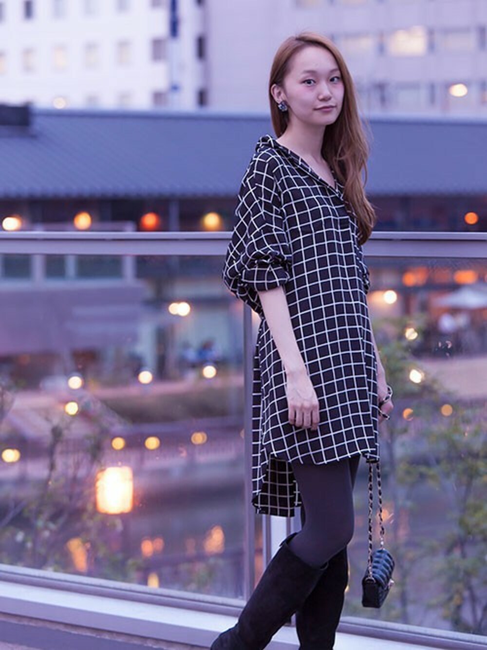 今年らしいウィンドウペンチェック柄のシャツワンピース。後ろに抜かしてルーズに着こなしました。