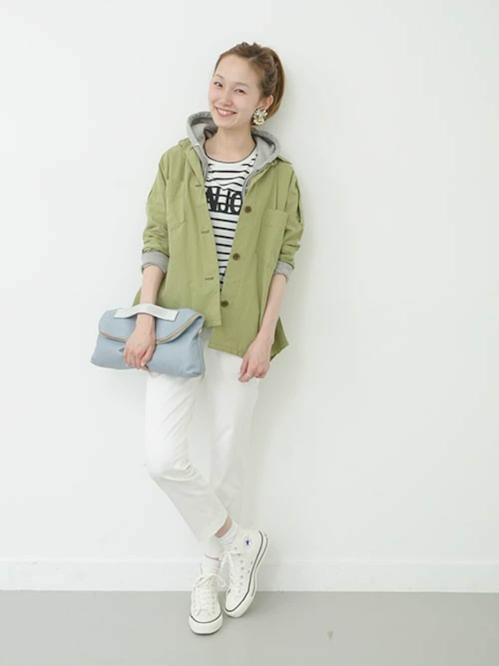 オーバーサイズのシャツジャケットインナーにパーカーを入れて、カジュアルスタイルを。それ以外はホワイトでクリーンにまとめて◎