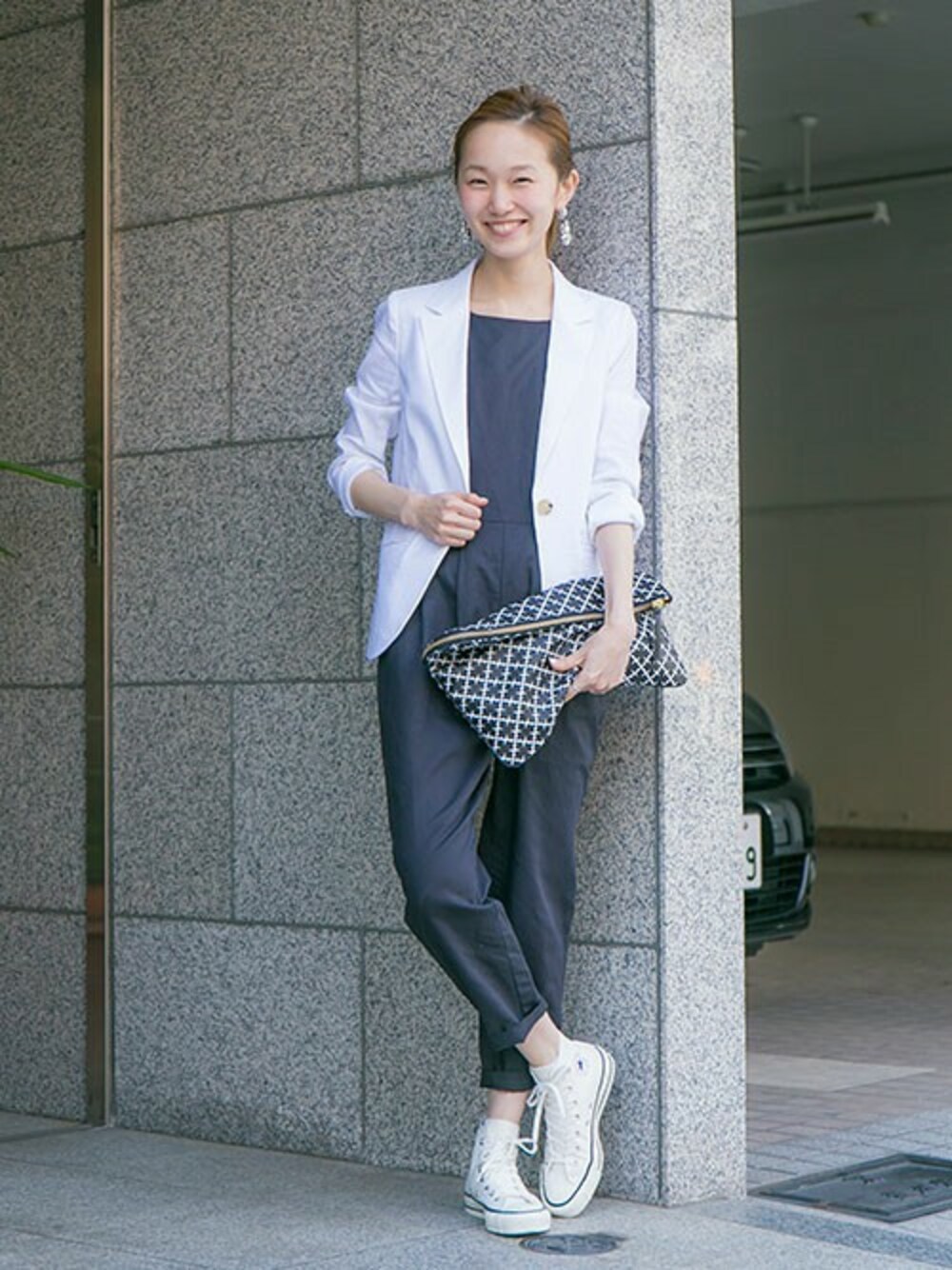 オールインワンにジャケットを。固くならないよう足元はスニーカー。ややゆとりのあるオールインワンを選び、ジャケットスタイルをモードでいて、リラックスムードを感じられるようラフに仕上げました。ホワイト×ブラックのモノトーンカラーも、素材を選んで軽さを出して◎