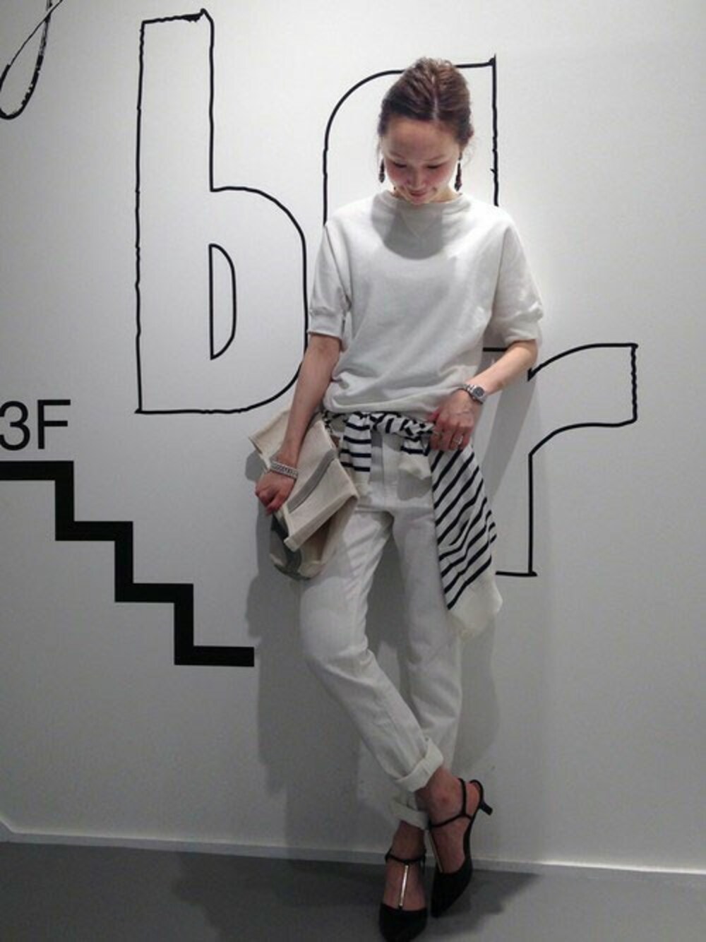 オールWhiteのスタイリングに、ボーダー柄でメリハリを◎