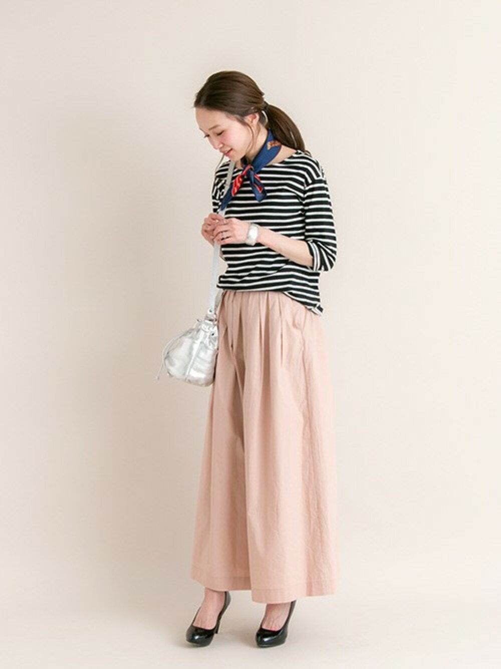 トレンドのワイドシルエットのパンツは柔らかなピンクカラーで春らしい印象◎ ブラックのボーダーで甘くなりすぎないようにし、スカーフをポイントに。 mio Instagram →M_OOO mio blog→http://ur-blog.jp/ur/?sid=mio