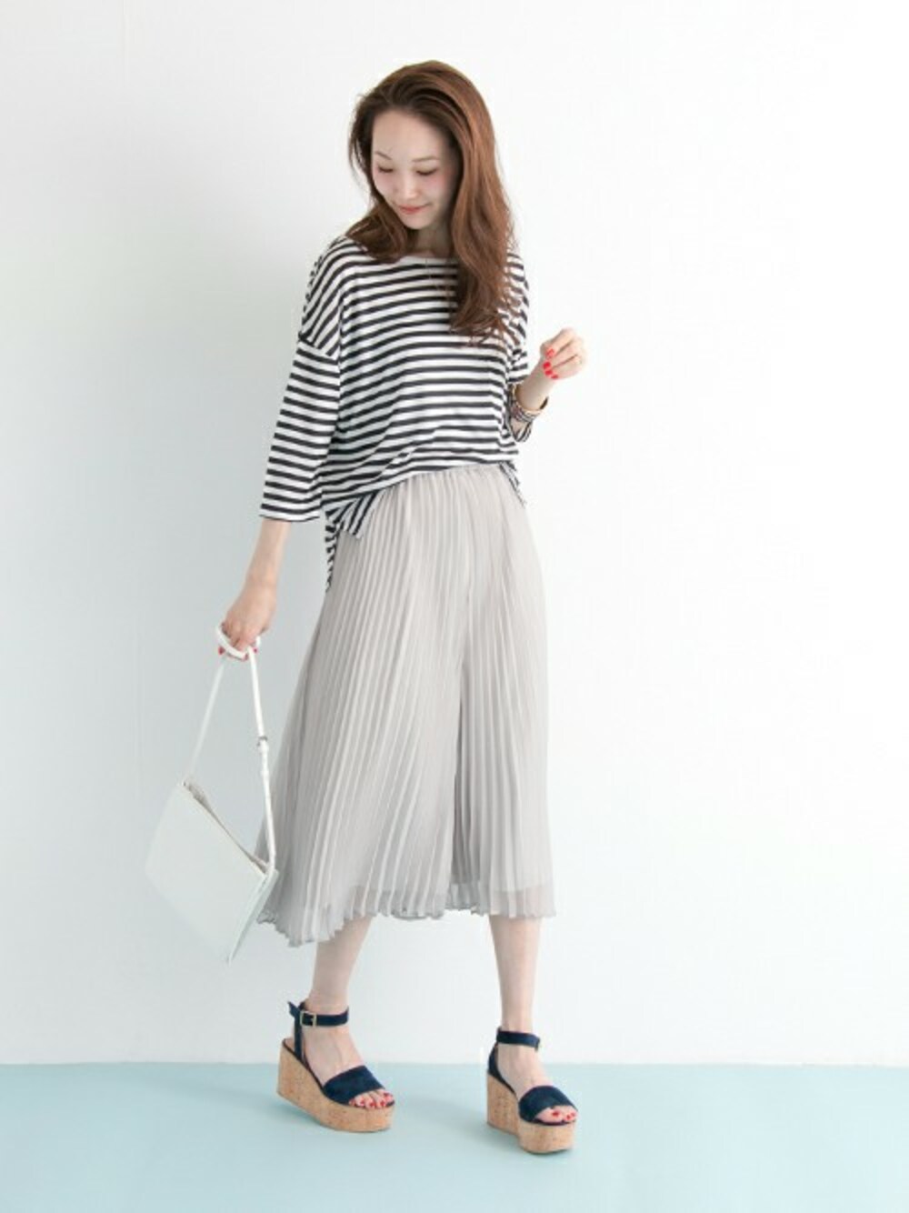 ゆったりシルエットのトップスを、人気のスカーチョでラフに合わせたスタイリング。 夏らしい涼しい着こなしで、カラーもネイビー×グレートーンで爽やかにまとめました。 mio Instagram →M_OOO mio blog→http://ur-blog.jp/ur/?sid=mio